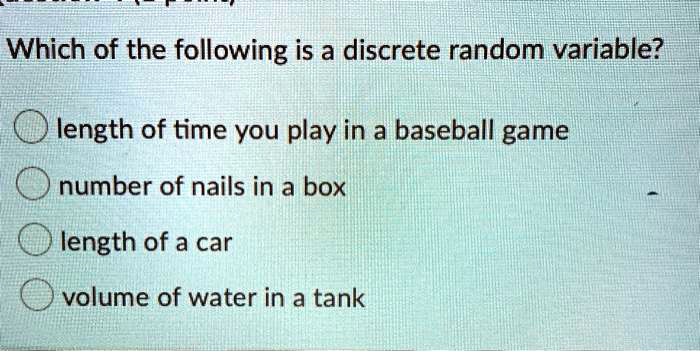 Source: https://www.numerade.com/ask/question/which-of-the-following-is-a-discrete-random-variable-length-of-time-you-play-in-a-baseball-game-number-of-nails-in-a-box-length-of-a-car-volume-of-water-in-a-tank-83855/